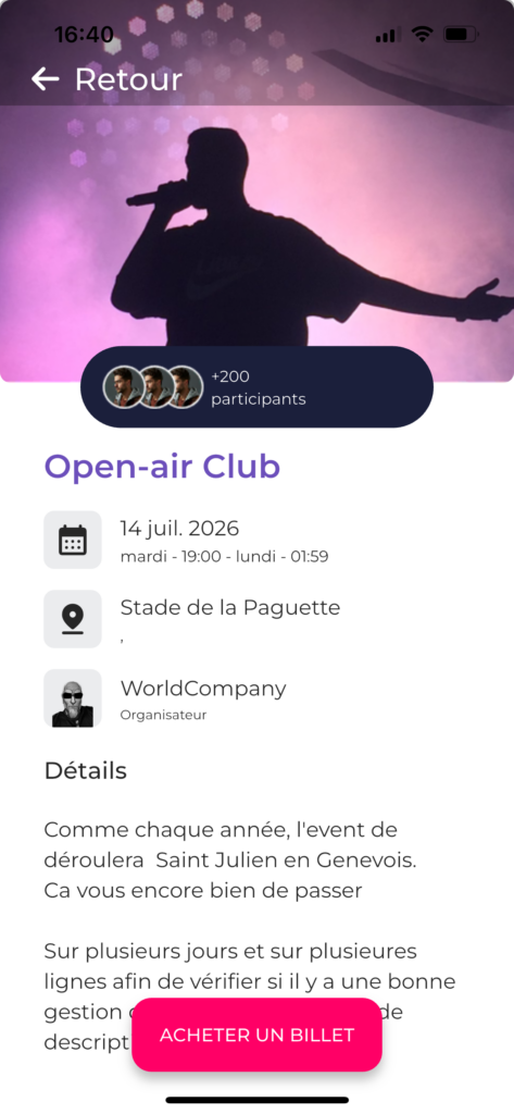 Les filtres sont ultra pratiques, je peux chercher par type d’événement, musique ou même prix. Trouver la soirée parfaite n’a jamais été aussi simple.